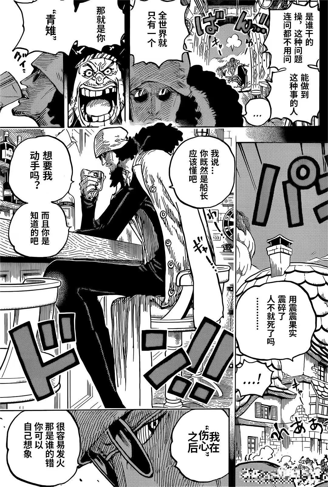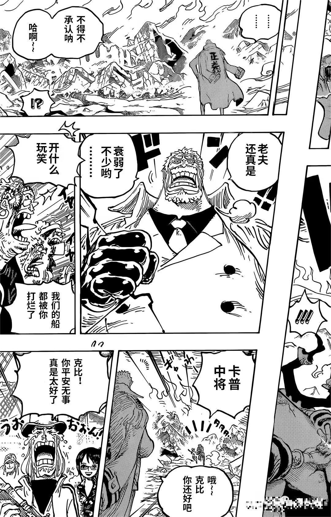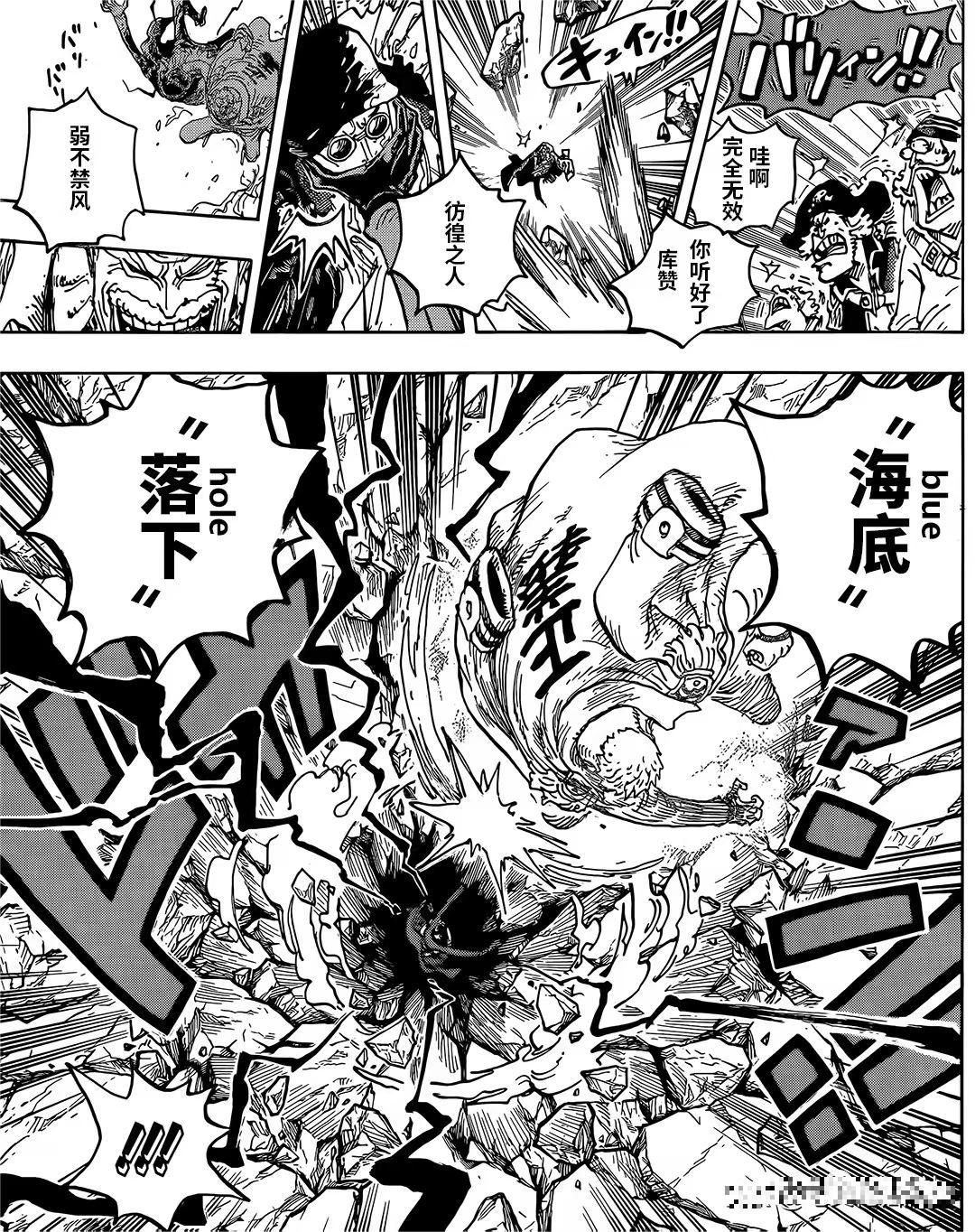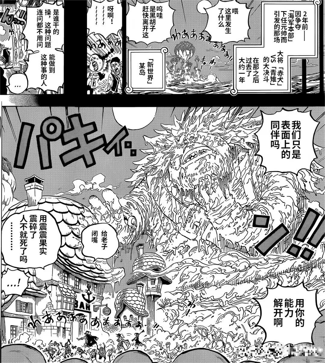 本话是库赞(前青雉)转变的关键篇章,围绕库赞与卡普的对峙展开。在胜者岛的战场上,库赞率领黑胡子海贼团彻底击垮了红心海贼团,克比等人被迫投降。库赞利用“震震果实”制造了毁灭性的冲击波,导致卡普的旗舰被摧毁,迫使卡普使用“死亡笛”进行紧急撤离,随后在极地潜水号的残骸中与库赞展开了激烈的肉搏战