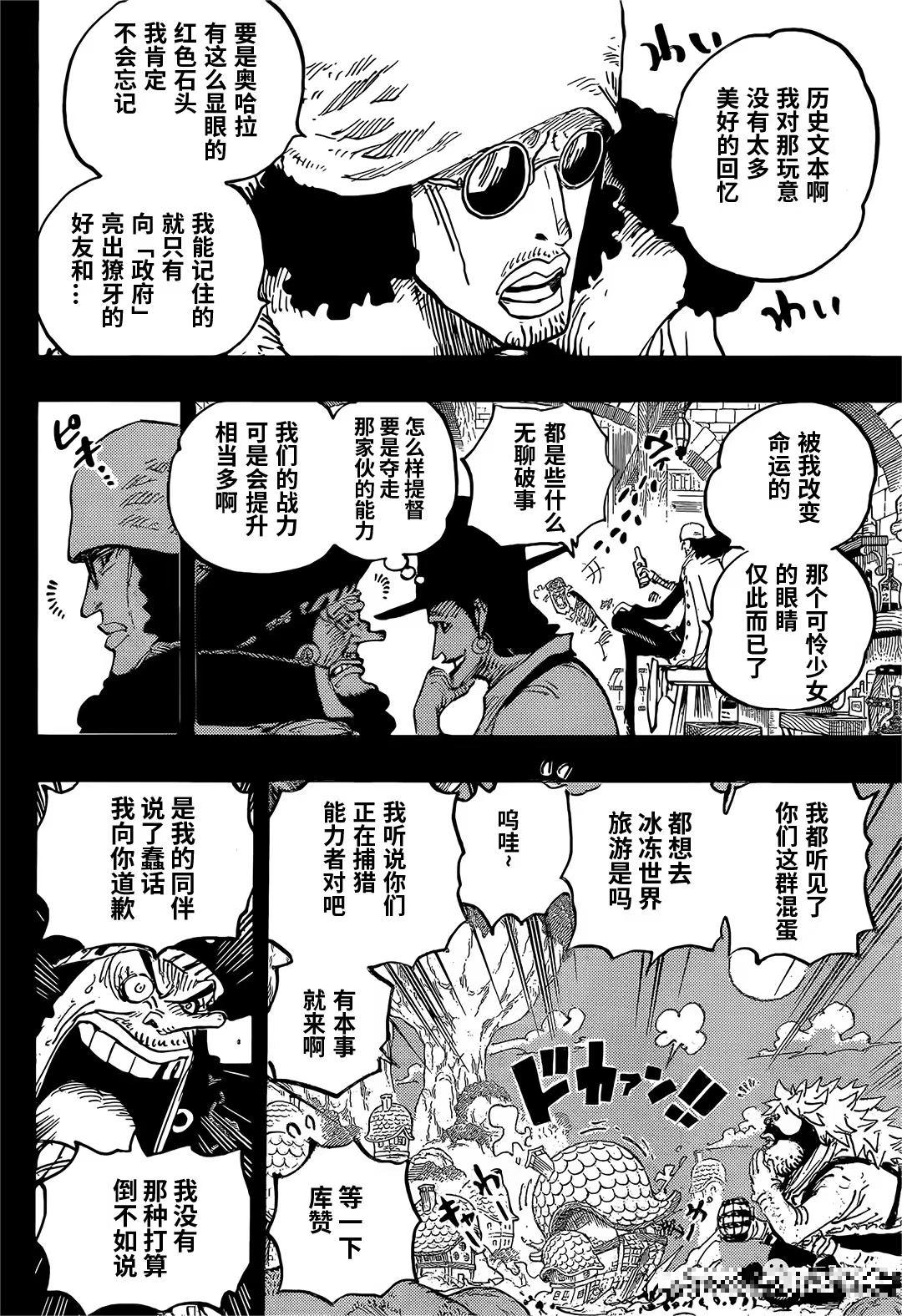 酒馆的回忆是本话的核心信息点。库赞与黑胡子讨论了世界上四块“历史正文”的下落,其中两块在凯多和大妈手中,另一块据说在“烧伤疤痕的男人”手中。两人暗示了“世界政府”可能藏匿了一块,并提到了一个能制造漩涡吞噬能力者的男人。库赞随后正式接受了黑胡子的邀请,正式登场为“黑胡子海贼团10号船船长”,并为自己的新身份画上了黑色的句号