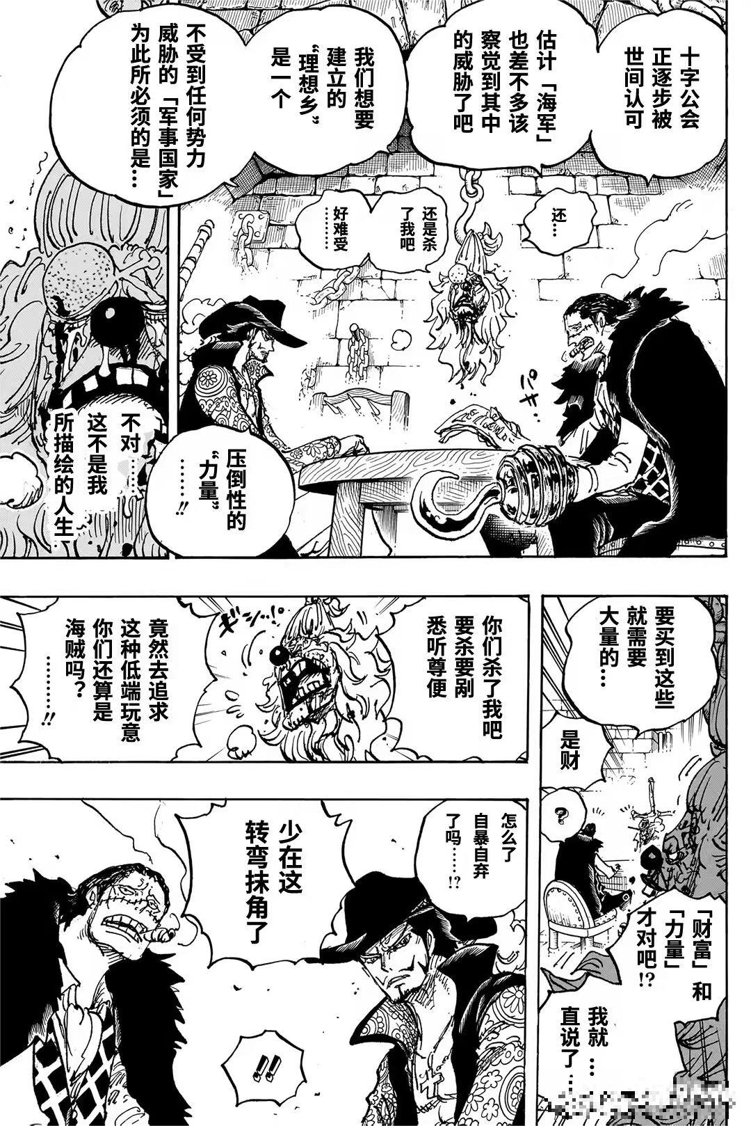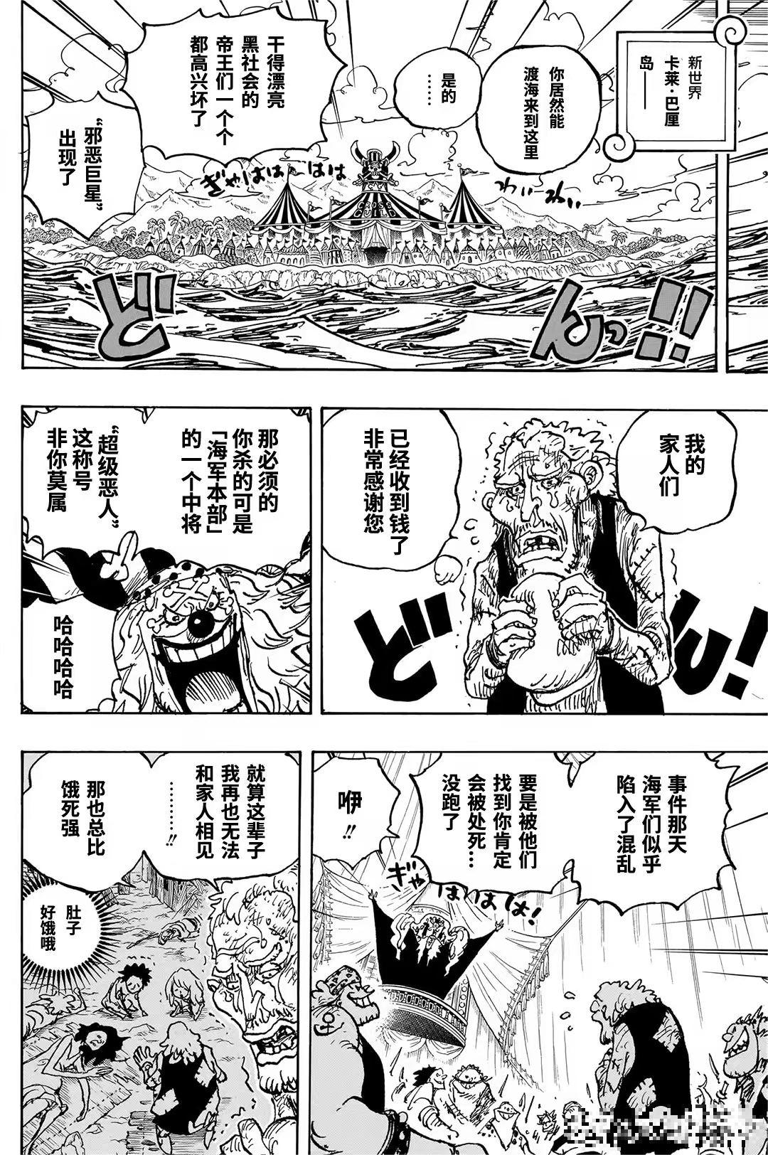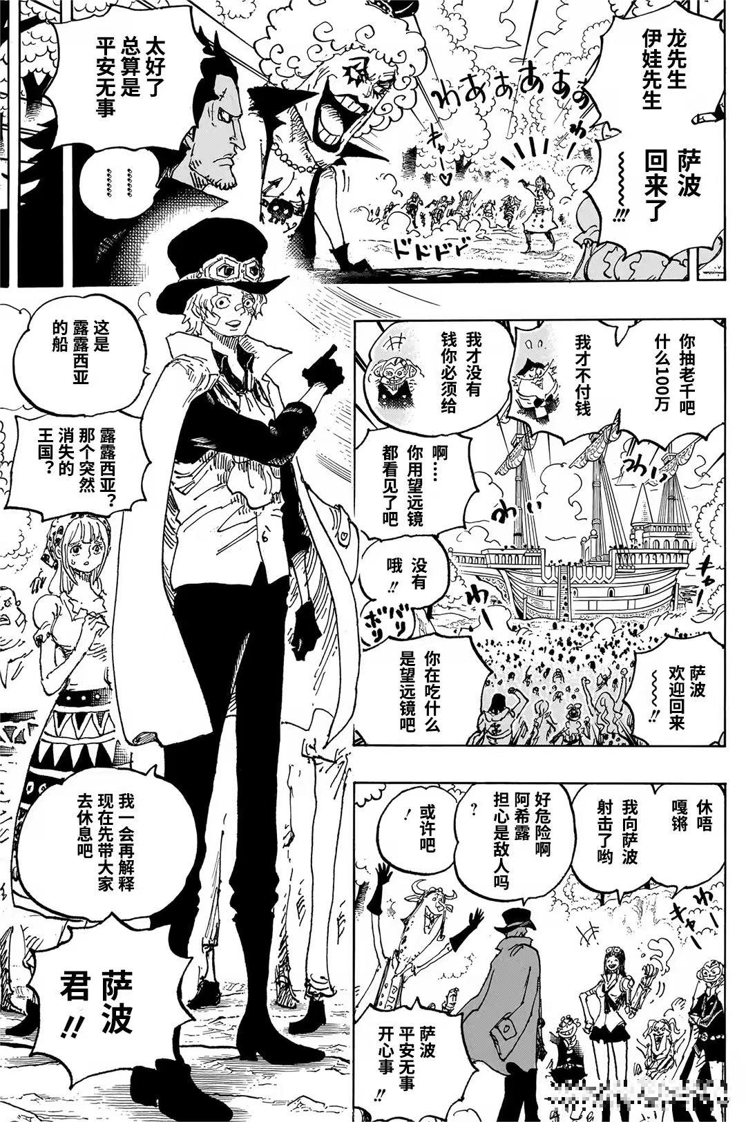 多弗朗明哥阐述了他的理想乡——一个不受任何势力威胁的“军事国家”。他自称为“超级恶人”,并庆祝家人已收到钱。萨波等人则抵达卡玛巴卡王国,围绕露露西亚王国的船只与真实情况展开讨论,暗示大秘宝的线索可能与此地有关