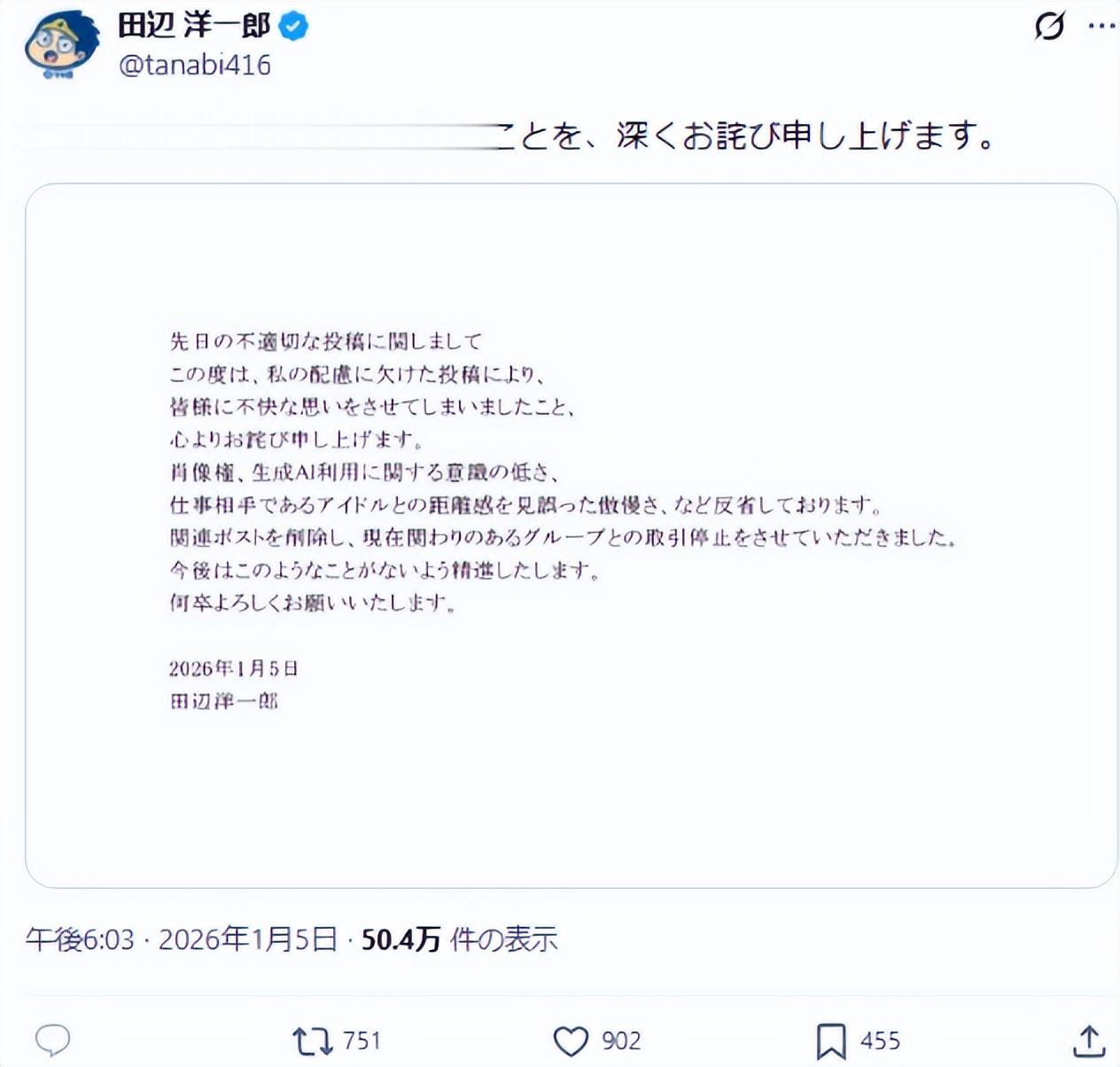 后来骂他的人越来越多,直到1 月 5 日晚间,田边洋一郎才在个人 X 上发布道歉声明。