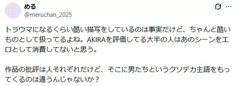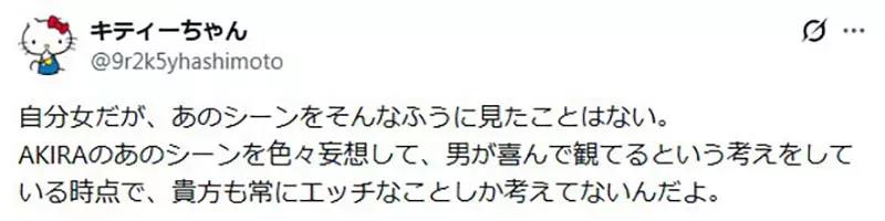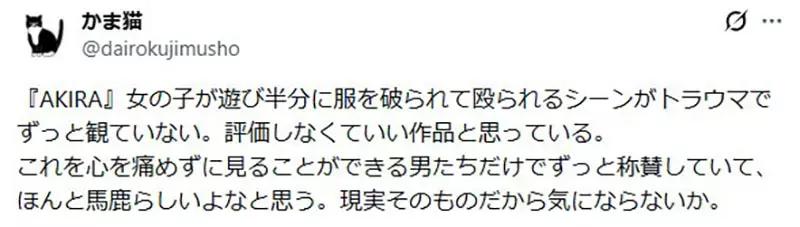 「《阿基拉》里有一段,女孩被像玩笑一样撕破衣服、还被殴打的画面,成了我的心理阴影。从那之后我就再也没重看过这部作品,也不觉得它有被评价的必要。只有那些可以毫不心痛地看完的男人,才会在那里不断吹捧《阿基拉》,真的让人觉得很愚蠢。也许对他们来说,那本来就是现实,所以才会无感吧。」
