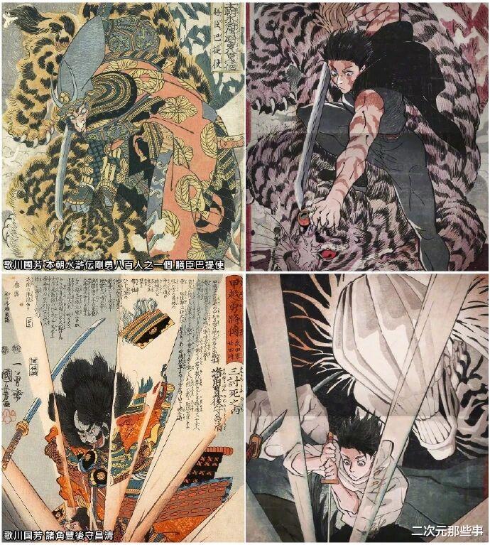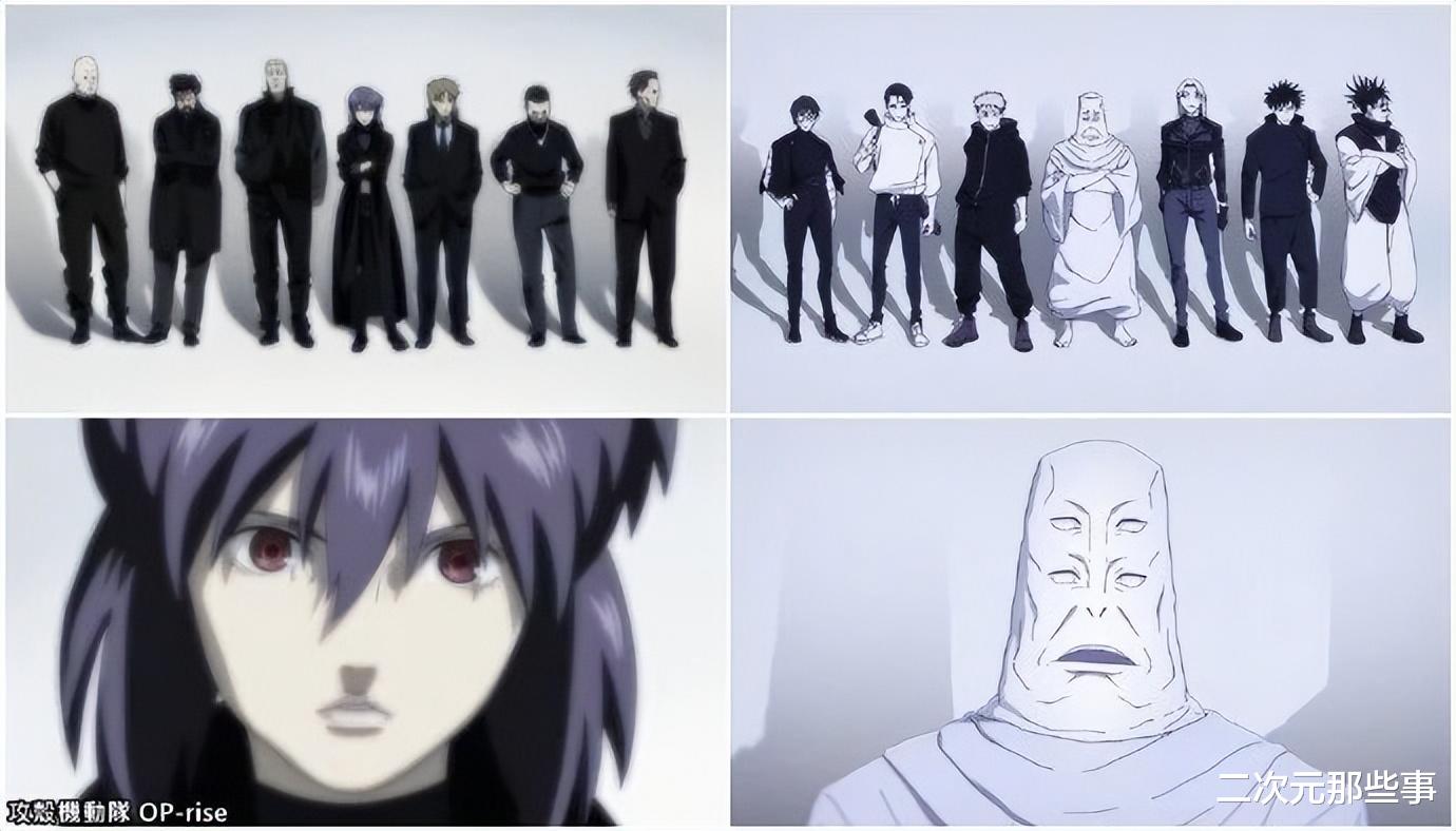 比如乙骨忧太的这两个镜头,也是“致敬”了日本著名浮世绘画家歌川国芳的两幅作品,不管是背后的老虎还是角色的动作都如出一辙。还有这张角色的站位图,很明显是“致敬”了经典动漫《攻壳机动队》。