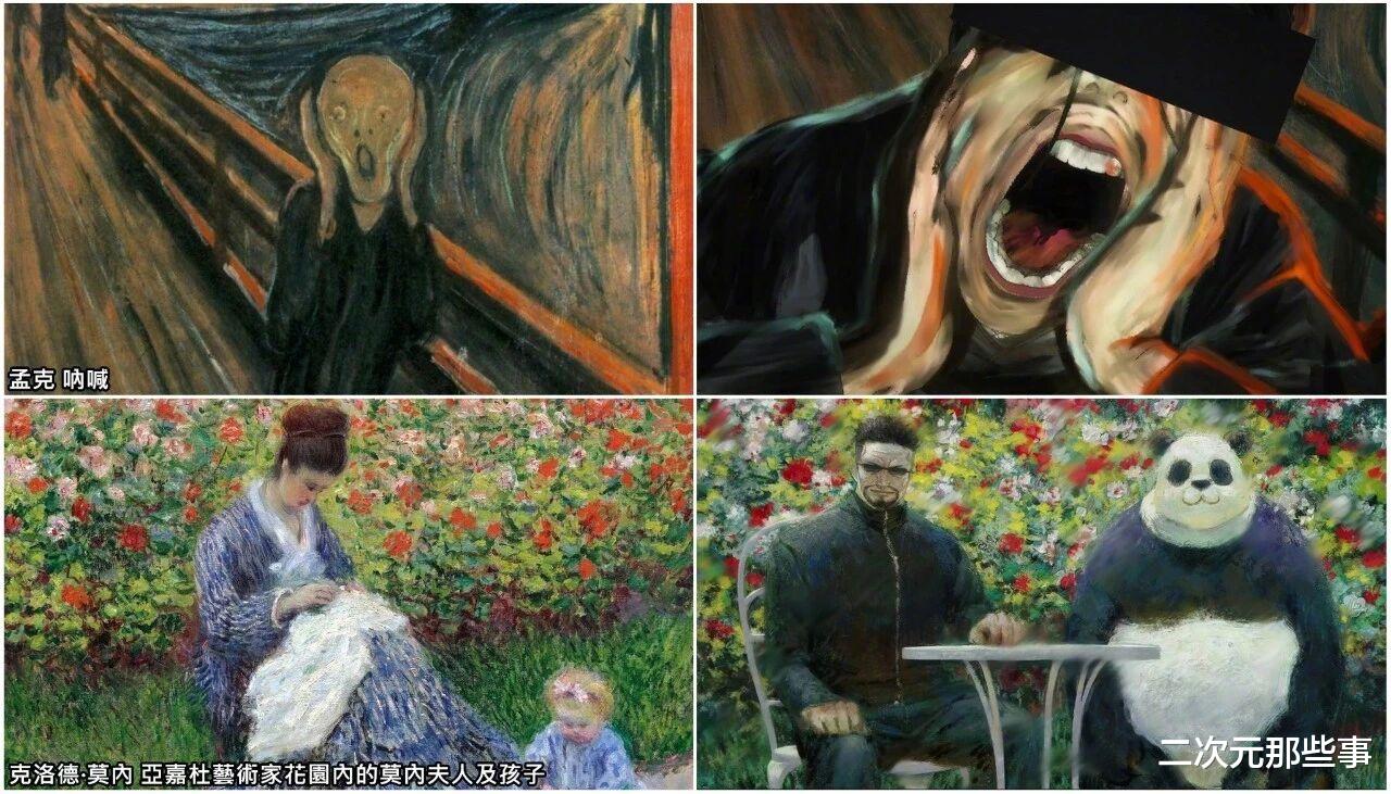 而夜蛾正道和熊猫的这个镜头背景应该是借鉴了莫奈的画作,至于这个扭曲的呐喊镜头大家应该都能看出来,挪威画家爱德华·蒙克的名作《呐喊》。