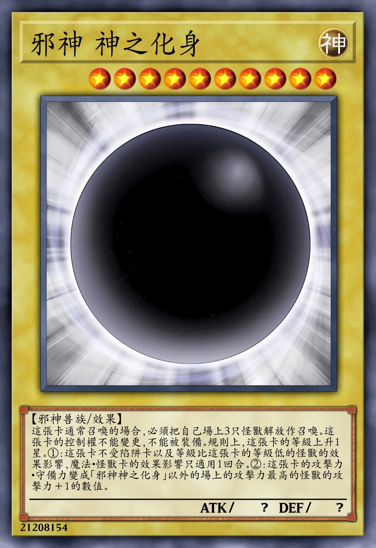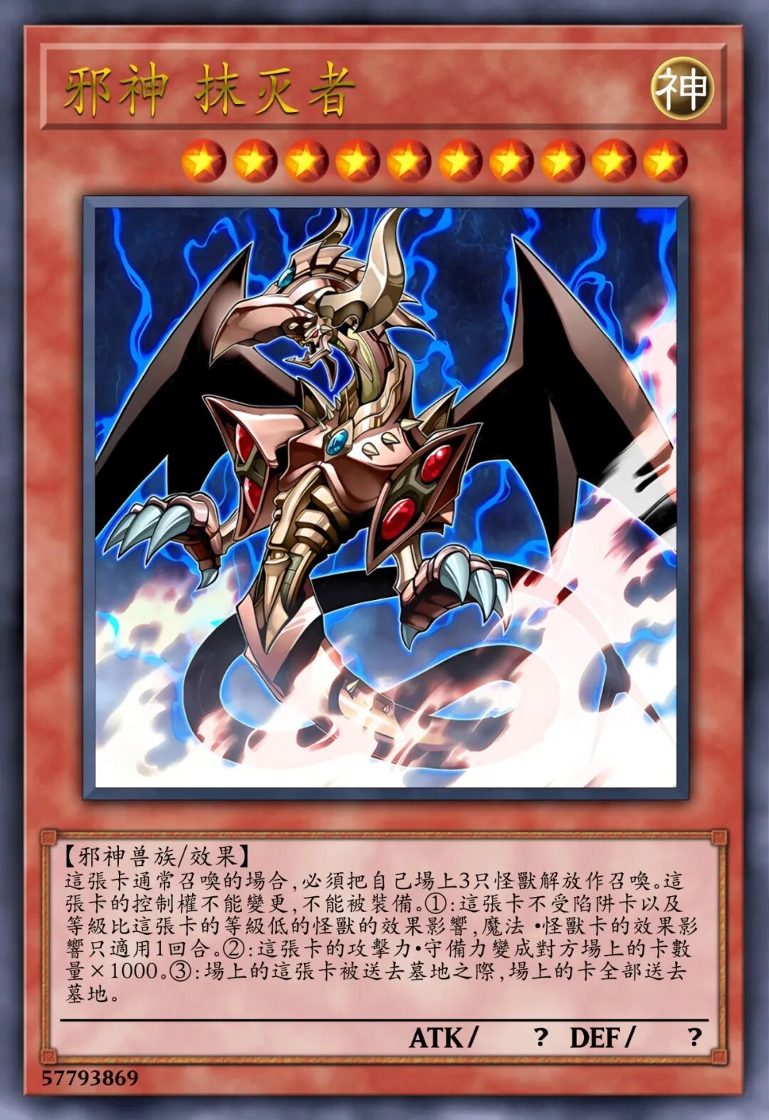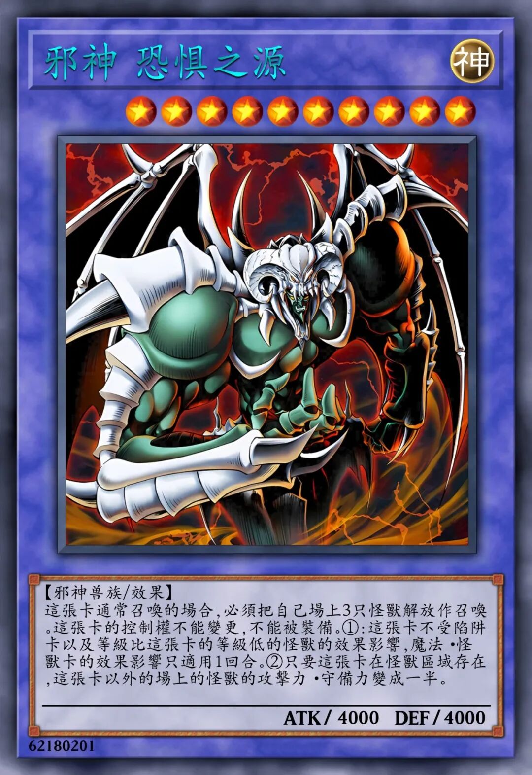 ATK/? DEF/?【邪神兽族/效果】这张卡通常召唤时,必须将自己场上3只怪兽解放来进行召唤。这张卡的控制权不能变更,也不能被装备。①:这张卡不受陷阱卡以及等级低于自身等级的怪兽的效果影响,魔法·怪兽卡的效果影响仅适用1回合。②:这张卡的攻击力·守备力变为对方场上的卡的数量×1000 。③:当场上的这张卡被送去墓地时,场上所有的卡全部送去墓地。
