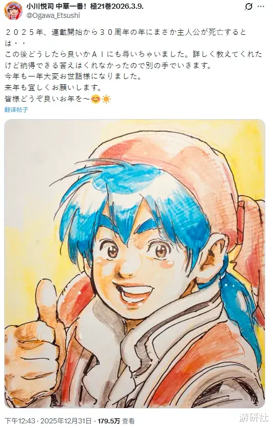 2025年的最后一天,经典料理漫画《中华小当家》(《中华一番!》)的作者小川悦司在自己X的主页上写了这样一段话:
