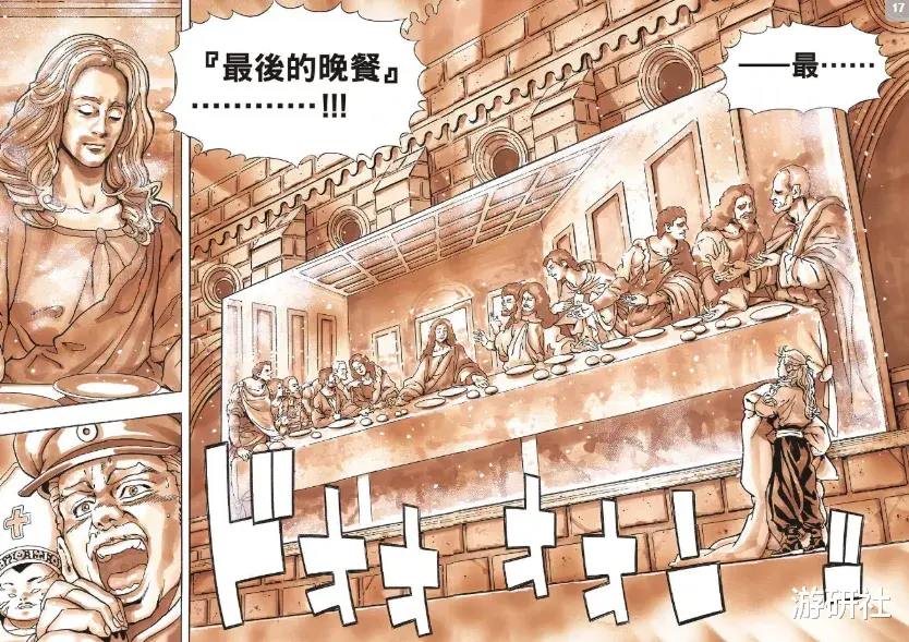 以及更抽象的西班牙海鲜烩饭“最后的晚餐”,按照剧情的解释,因为比赛时间不够,所以厨师索性将所有食材放在锅里一起煮熟,最后根据材料的形状和颜色不同,迅速拼凑出了达芬奇名画《最后的晚餐》——虽然作者并没有解释为什么没时间做菜却有时间摆“盘”。