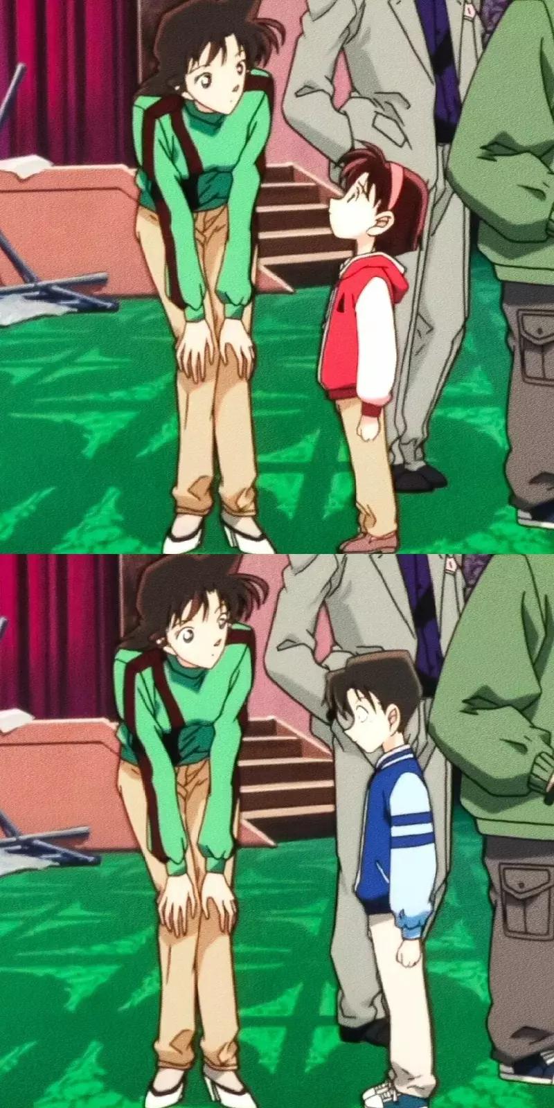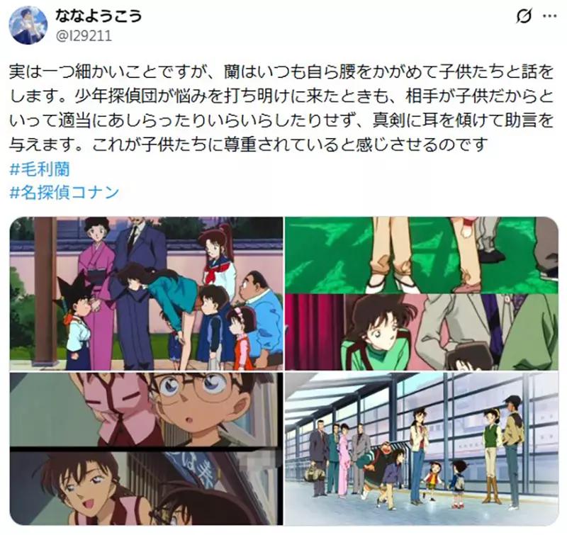 当然这个是老粉丝才知道的“长期设定”,熟悉《名侦探柯南》的人都知道,毛利兰弯腰、蹲下和小朋友交流,并不是偶然。