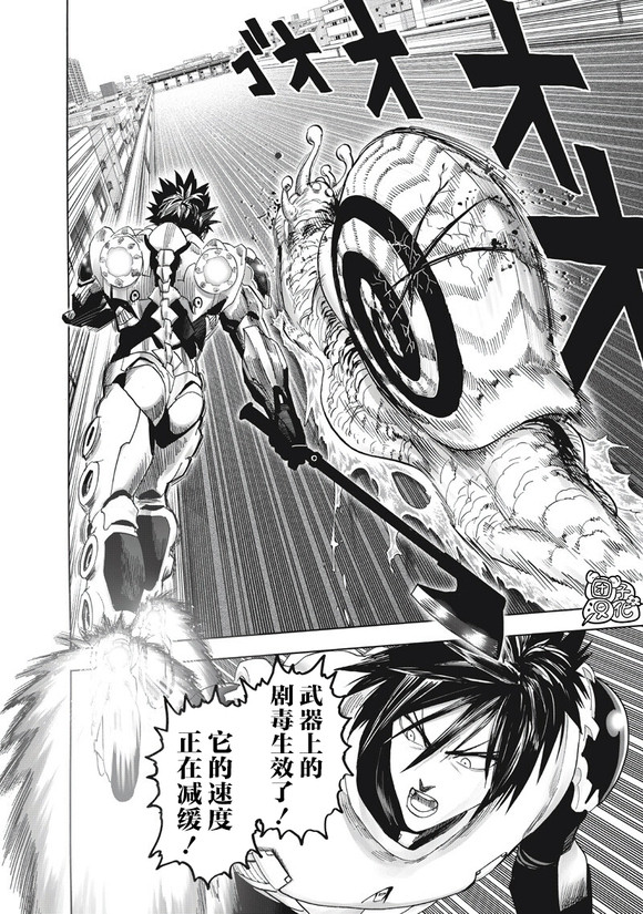 本话紧接上一话的内容,爆速蜗牛好歹也是鬼级的怪人,虽然被重伤了,但是并没有死亡。不过阿克塞尔的武器上还有剧毒,倒是减缓了他的速度!