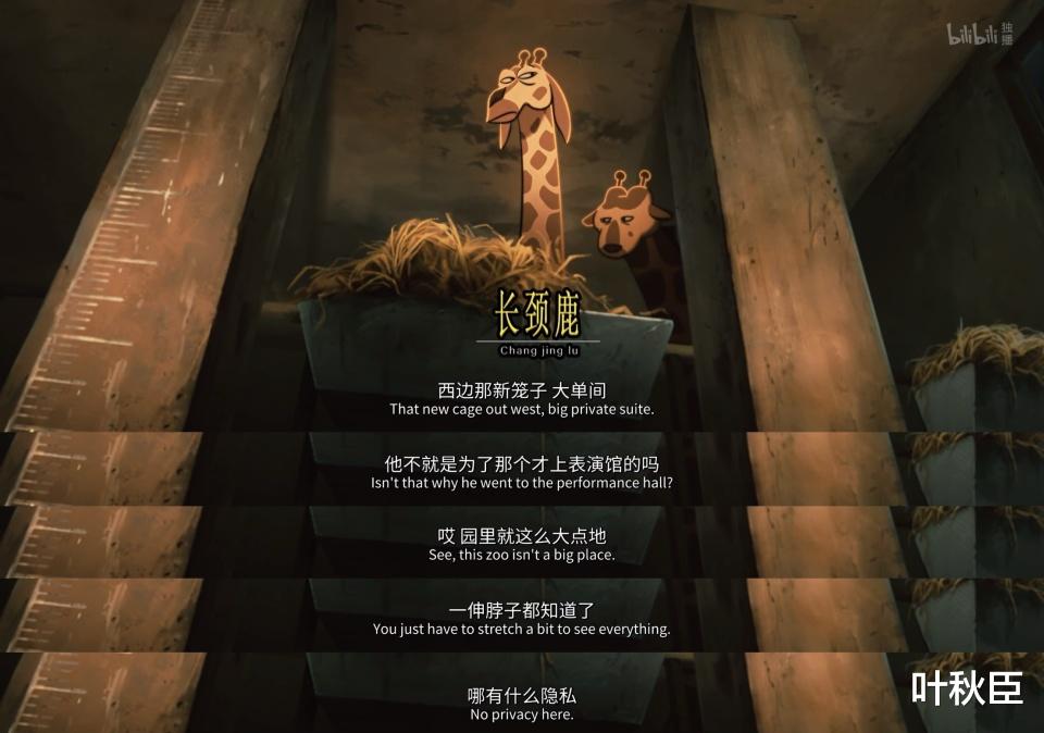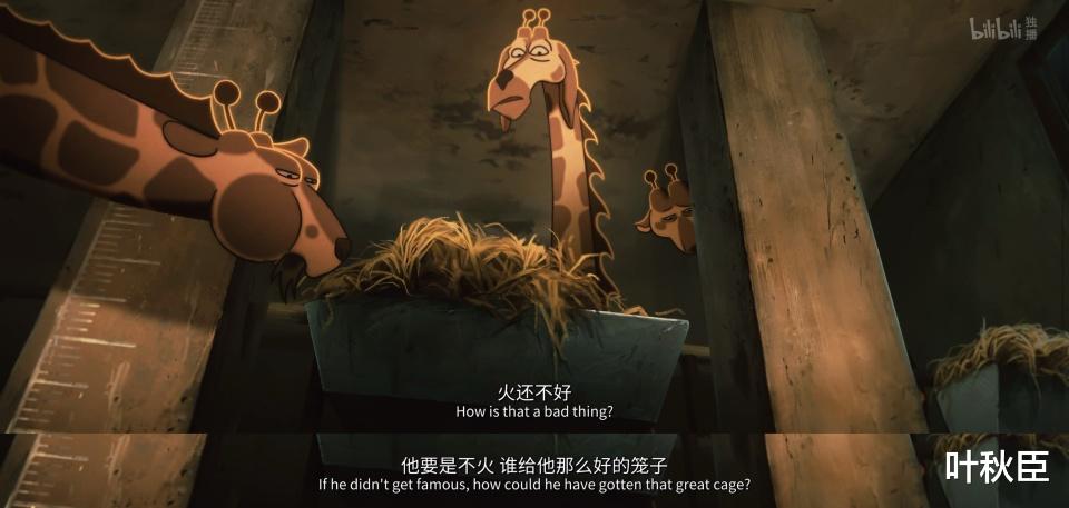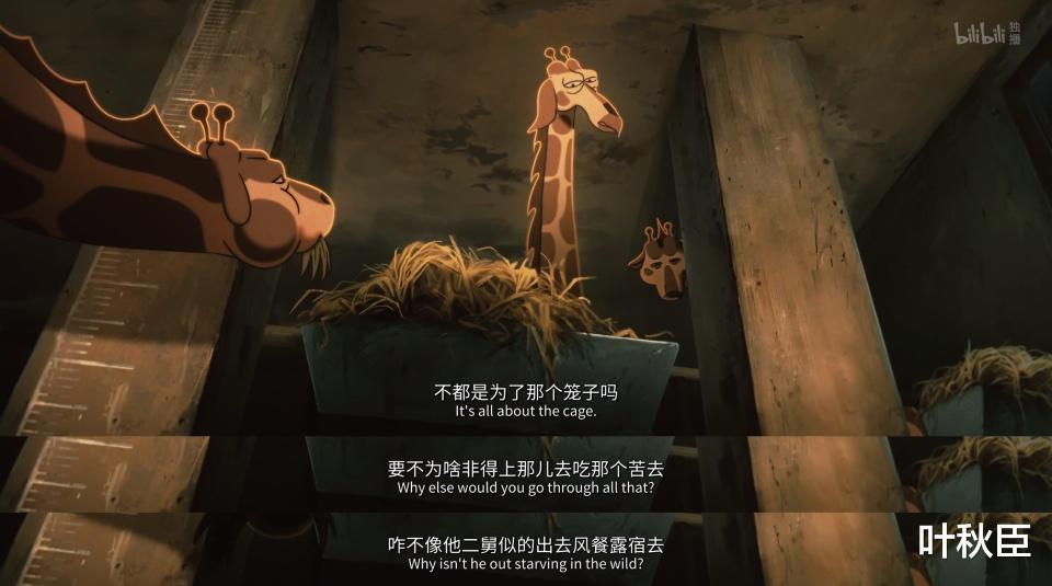 长颈鹿馆内舍里,讨论的则是小熊去表演馆只是为了住更大的笼子,否则何必吃这个苦?在他们眼里,只有监狱和更大监狱的区别而已。同时刻意突出自己脖子长的优势,认为动物园的一切都尽收眼底,实际上却大多靠蒙。要是听不清,就说自己气短低不了头,可面对游客的喂食,依旧非常配合地弯下了腰。