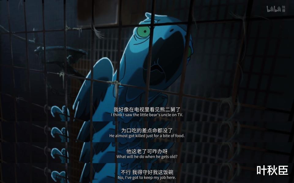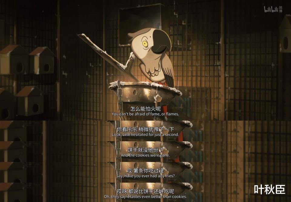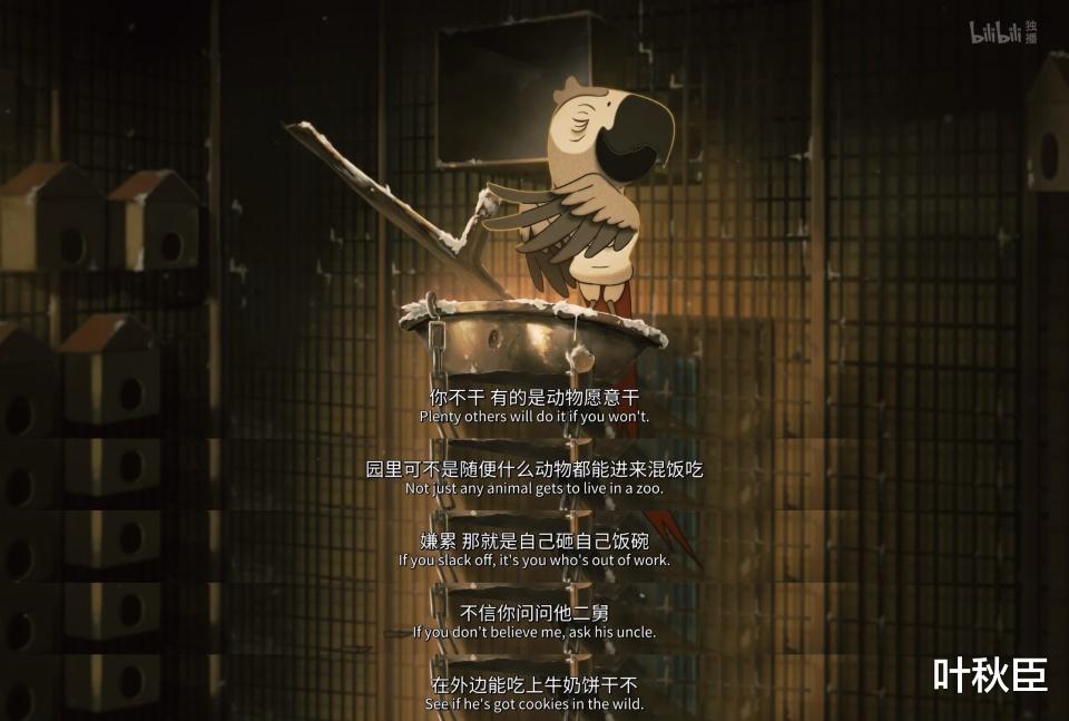 飞禽馆内舍里,灰鹦鹉说表演可以获得牛奶饼干,嘴里讲着“爱老虎油”这种过时的梗,觉得成功就是获得更多的牛奶饼干,而他所能想到最好吃的东西也就是薯条。