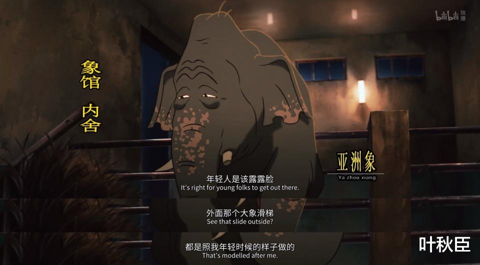 象馆内舍里,年迈的亚洲象表示年轻人应该出去露露脸,他还提到园内的滑梯是参照自己年轻时做的,顺便嘲讽一番熊猫形象的垃圾箱,只念着过去那点功绩,还看不上现在有名的。