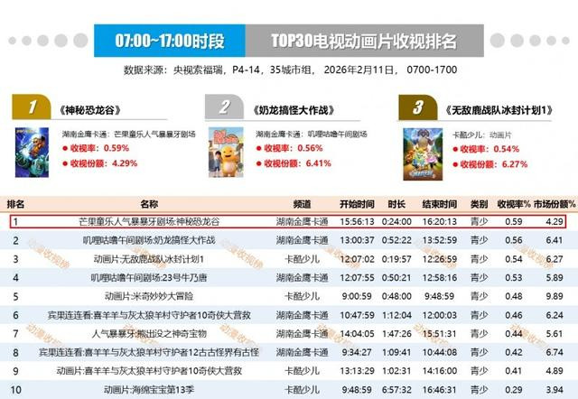 《神秘恐龙谷》自2月9日上线金鹰卡通卫视全国首播以来,迅速收获观众们的喜爱,登上白天时段收视率榜首。