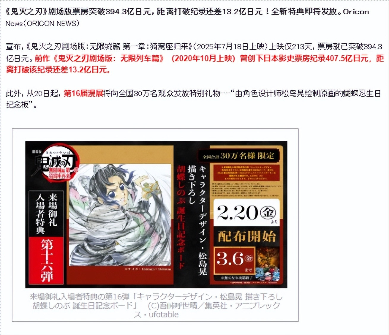 距离当年那部创造奇迹的《鬼灭之刃 剧场版 无限列车篇》407.5亿的纪录——只差13.2亿。