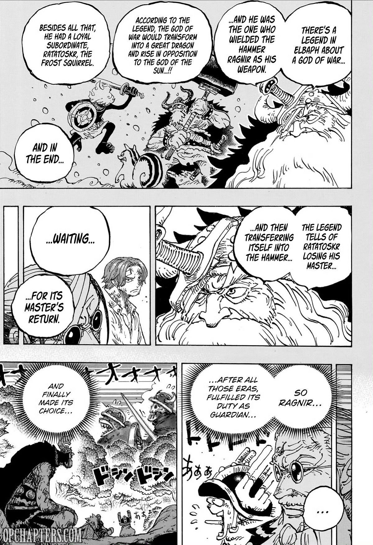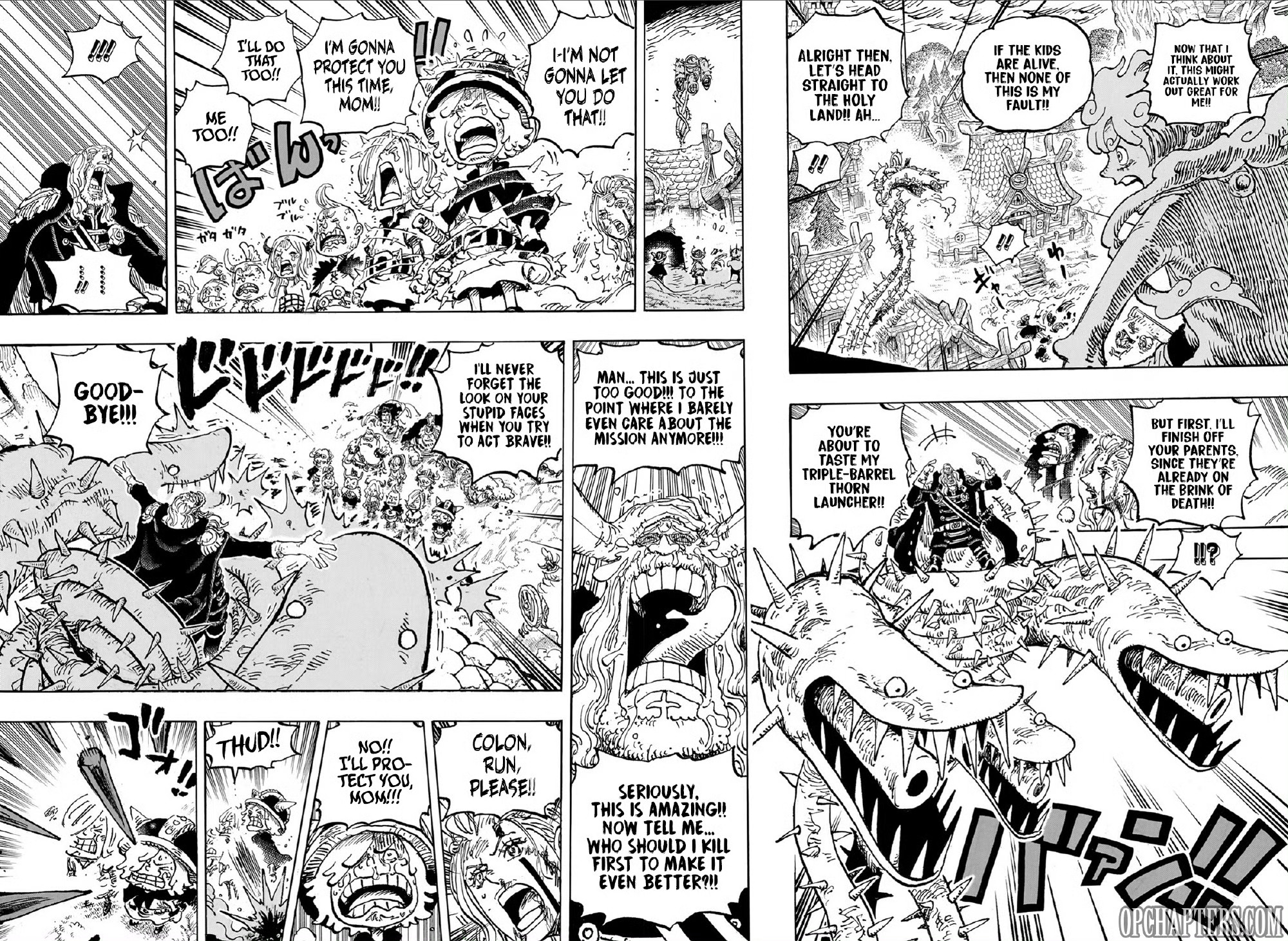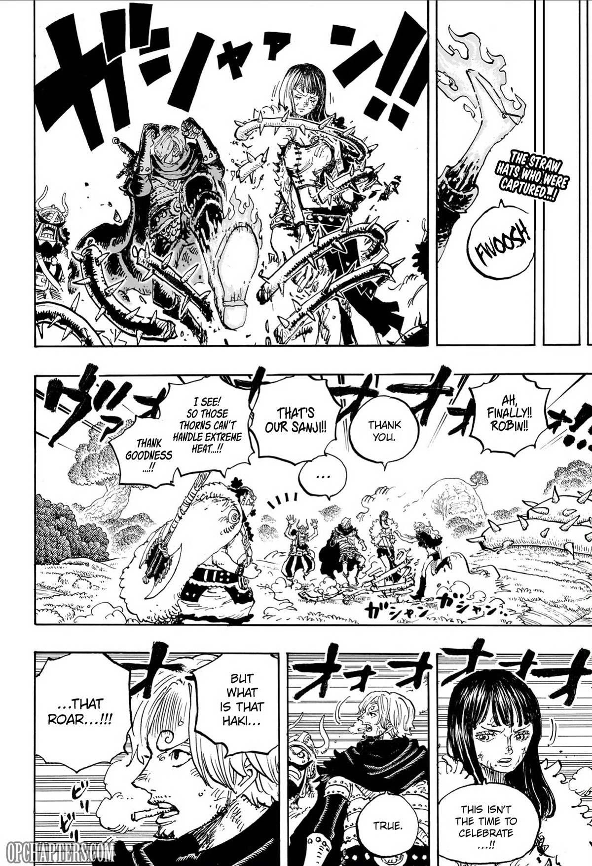 漫画最新一话的标题是雷龙,扉页小故事是萨博和二嫂的故事,他们正在跟一群考拉玩耍。山治来到八号森林,他成功救出了罗宾,甚平发现了荆棘的弱点是怕火。罗宾很担心孩子的安全,他们正看着远处的怪物。