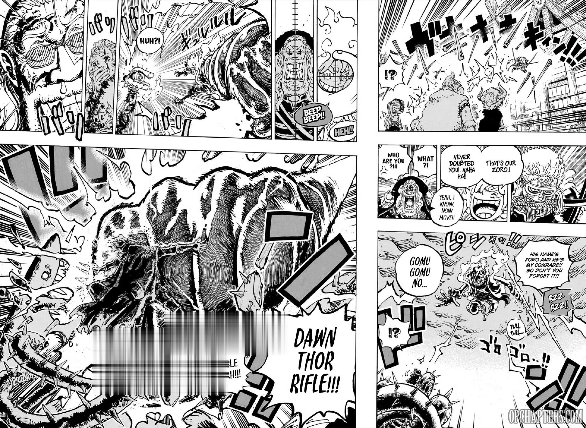 索玛兹圣发起进攻,孩子挡在前面,索隆出手挡住了荆棘的攻击,尼卡路飞很开心,他一直很相信索隆。尼卡路飞也手持闪电杀过来,他使用了五档新招式,一拳就把索玛兹圣击败。