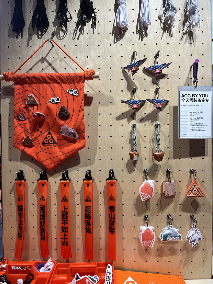 在“ACGBYYOU全天候装备定制”区域,销售着特殊的地域限定配件,满足消费者在户外的个性化需求。例如,北京雨燕挂饰和“一溜烟就倒到顶”“城市太危险”等橙色飘带。演员此沙在现场探店购买的“香山常客”飘带,甚至引发了粉丝在网络上的“求代购”。
