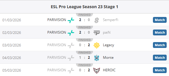 虎扑03月06日讯EPLS23第一阶段最后一个比赛日全部结束,PARIVISION爆冷0-2不敌HEROIC,在一度开局2胜0负的大好局面下,最终苦吞三连败被淘汰出局。
