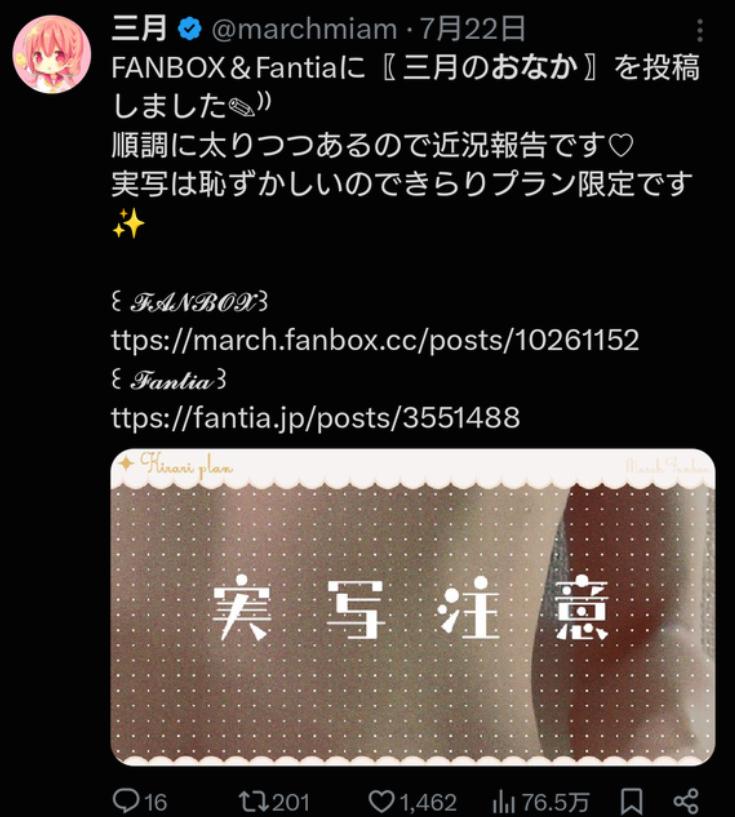 前两天,日本网友突然在 X(原推特)上炸锅:三月老师在自己的创作者付费平台上,发布了一条“极度私人化”的动态,配文还写着类似“最近状态有点变化”“如果愿意可以看看”。