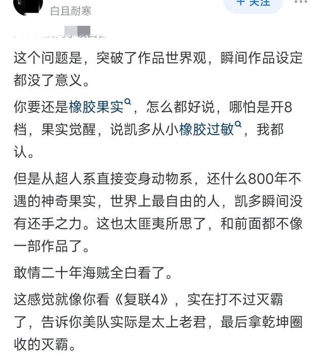 ### 五、给你三个能拿来“说服自己”的角度1. 能力升级≠人格升级 凯多老师早就盖章:“霸气凌驾一切。”果实只是配件,和之国最后那记“猿神枪”靠的依旧是路飞自己练出来的霸王色硬化——硬件换新,软件还是20年手写代码,不算换号重练。 2. “神”是别人封的,路飞从没认领 五老星喊“太阳神”,路飞听得到吗?他耳朵只装得下“肉”和“伙伴”。称号是读者给的,自由是他自己要的,两者不在一个频道。 3. 故事母板本来就是“解放者” 阿拉巴斯坦救国民、空岛砸神艾尼路、鱼人岛撕天龙人旗……路飞一直干的都是“尼卡”该干的活,只是以前穿的是橡胶外套,现在换了件带太阳logo的卫衣,内核没换。